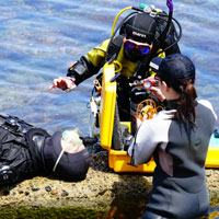 ●酸素供給法「意識のあるダイバー、意識のないダイバー」に対しての使用マスクの違い、減圧障害の疑いのあるダイバーに必要な毎分流量などDAN(ダイバーアラートネットワーク)指定のPINバルブ酸素レギュレータを使い習得します。 |