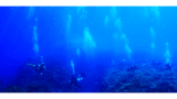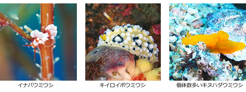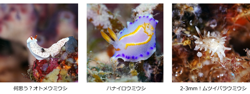 水中は青く透明、連日三代目金三郎は絶好調でダイバーの周りを大暴れの大サービスです。ブルーバック(青い背景)に”ウミウシたち”がとてもきれいです。
