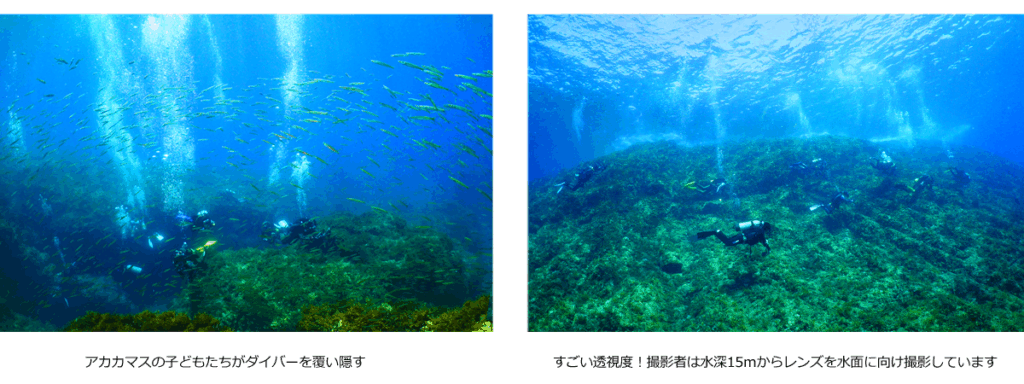 こっちは、岩礁が端から端まですべて見えています。最低水温で27℃あります。興奮に満ちた応答が帰ってきた。──間違いなく今シーズン一番の海だ。