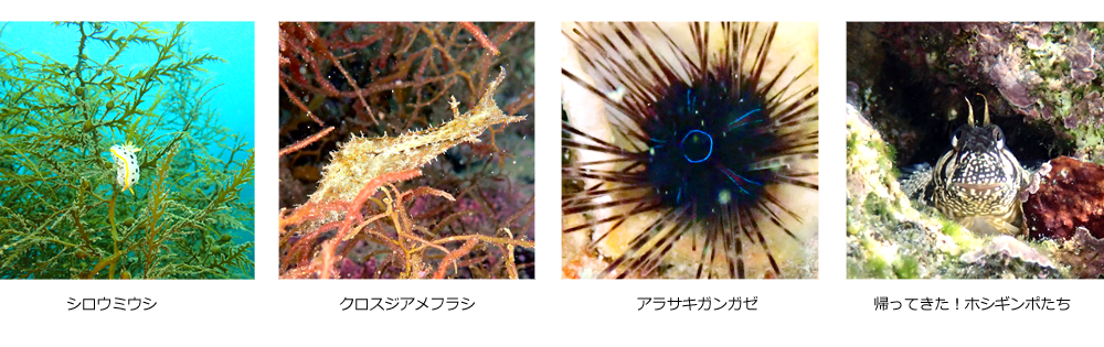 今回はその記録装置の回収と生育状況の調査を目的に、調査ダイバーチームとファンダイブチームでビーチダイブを実施しました。調査チームは水温記録装置を回収し、サンゴの大きさを丁寧に計測。一方、ファンダイブチームは旬の海洋生物たちとの出会いを楽しみました。そうそう、ホシギンポの数個体が戻ってきていました。この季節、この水温が彼らのお気に入りのようです。