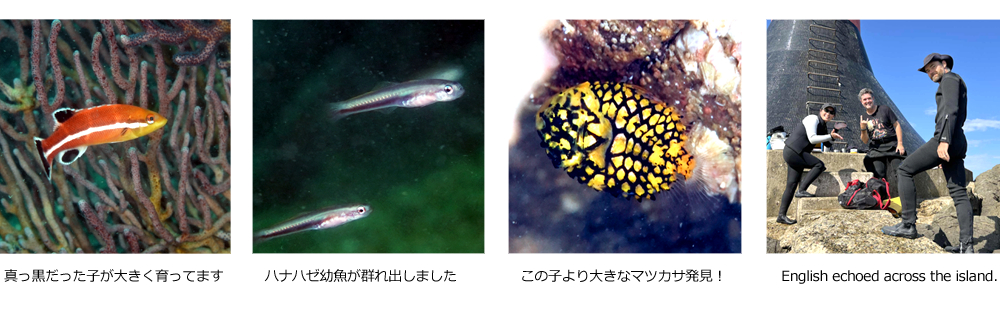 一方、本日はジェッティでのファンダイブです。参加されたゲストは、アイルランド国籍とアメリカ国籍のダイバー。初対面の挨拶を交わした後は、自然と英語での会話が続いていました。目を閉じて太陽の光を浴び、波の音に耳を傾けていると、まるで海外のリゾート島にいるかのような錯覚に包まれました。人懐っこい、初めての、大きなコブダイ(三郎)と大きなマダイ(名はまだない)に大興奮しておりました。