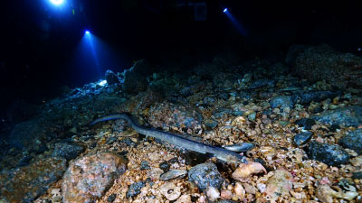 昼間寝ている夜行性生物は活発に動き回ります。例えばホタテウミヘビ、昼間は砂地から顔だけ出して寝ていますが夜はご覧の通り全身を観ることが出来ます。エビやカニといった甲殻類も夜行性、反対にマダイやコケギンポなどは寝顔を観ることが出来ますよ。